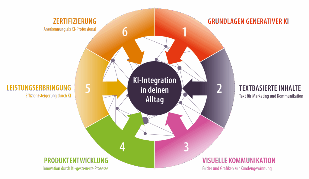 Diese 5-teilige Reihe versetzt dich mit einem klaren Fahrplan „hands on“ in die Lage, generative KI fundiert und praxisnah in deinen Arbeitsalltag zu integrieren. Die Module finden im wöchentlichen Rhythmus statt, wobei zwischen dem vierten und fünften Modul eine zweiwöchige Praxisphase liegt, um das Gelernte zu vertiefen.